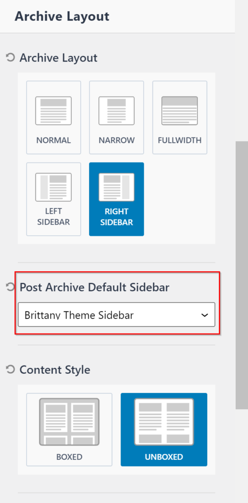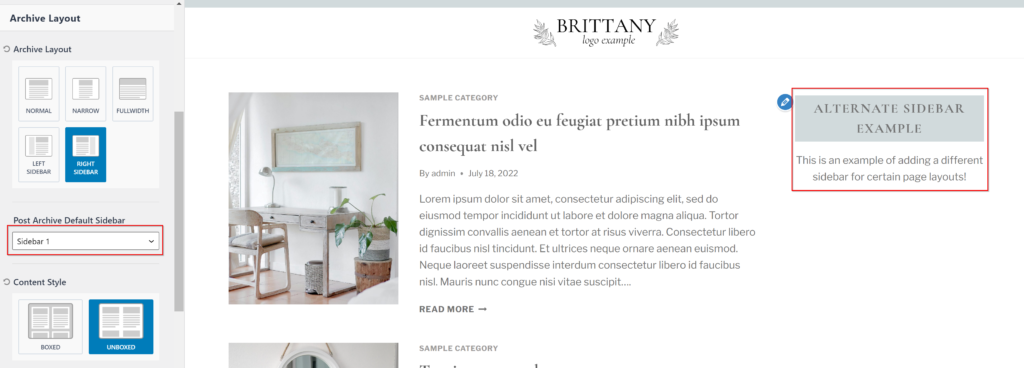 - Change the placement of the sidebar, or remove it, under Archive Layout.