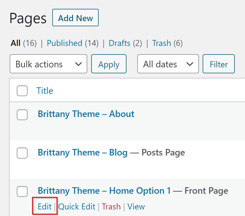 - In the Admin Dashboard, go to Pages and locate Brittany Theme – Home Option 1 and click Edit.