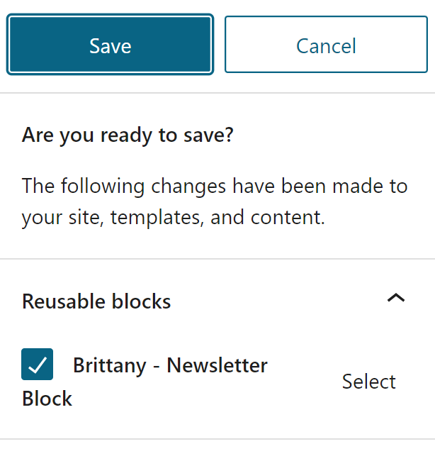 - When you want to save, you may see a white dot next to the save button, and a popup asking if you’re ready to save. This is simply notifying that a change has been made to your Reusable Block, and it will be updated in all locations where it’s placed. Click Save again to confirm!