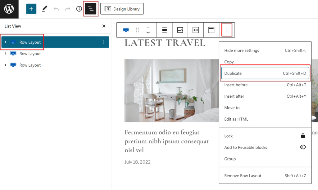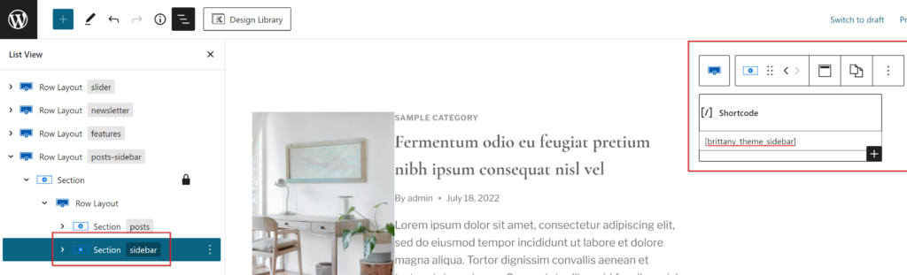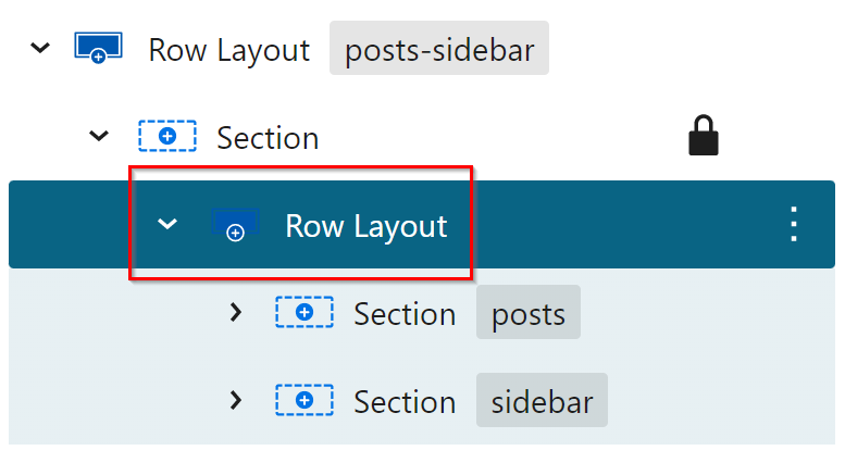 - Open the List Navigation by clicking on the three vertical lines icon in the top of the page, then click on the “Row Layout” named posts-sidebar.