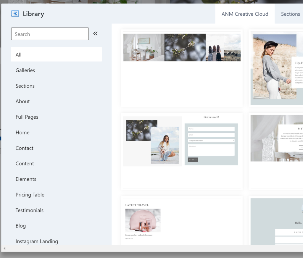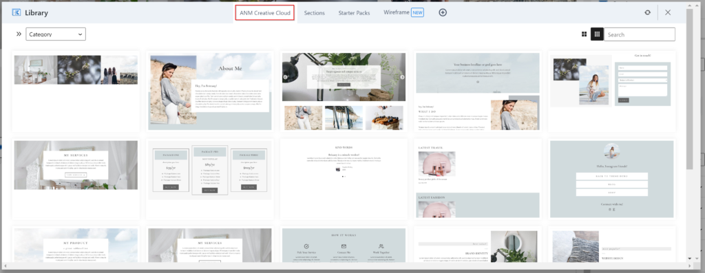 The design library can be accessed from any page or post editor. At the top of the page, you’ll notice a button that says Design Library. Click on it! A popup will appear with four different tabs at the top. At the left, locate ANM Creative Cloud. This will then display all of the Brittany theme related content available for you to use ANYWHERE on your site! Simply click on the element you want to add to your page and watch the magic happen!
