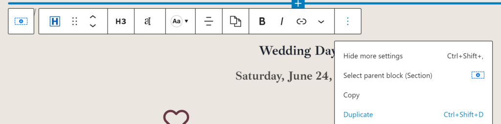 - To add more to the schedule, select the item you want to copy, then click the three dots icon to the far right, then Duplicate. (Or, simply click Ctrl+Shift+D with the item selected)