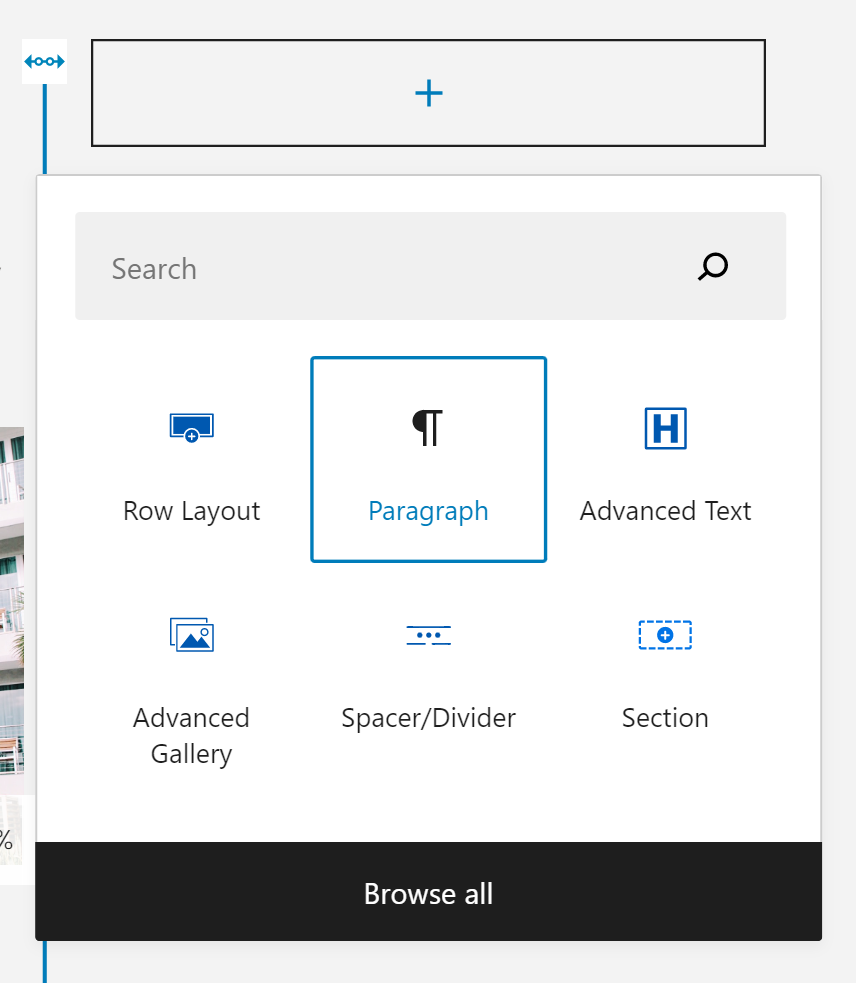 - Click the plus sign of the newly created column, then click on Paragraph module to add a blank workspace to the column (if you don’t see Paragraph, simply type it in the search bar).
